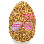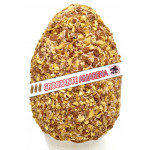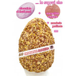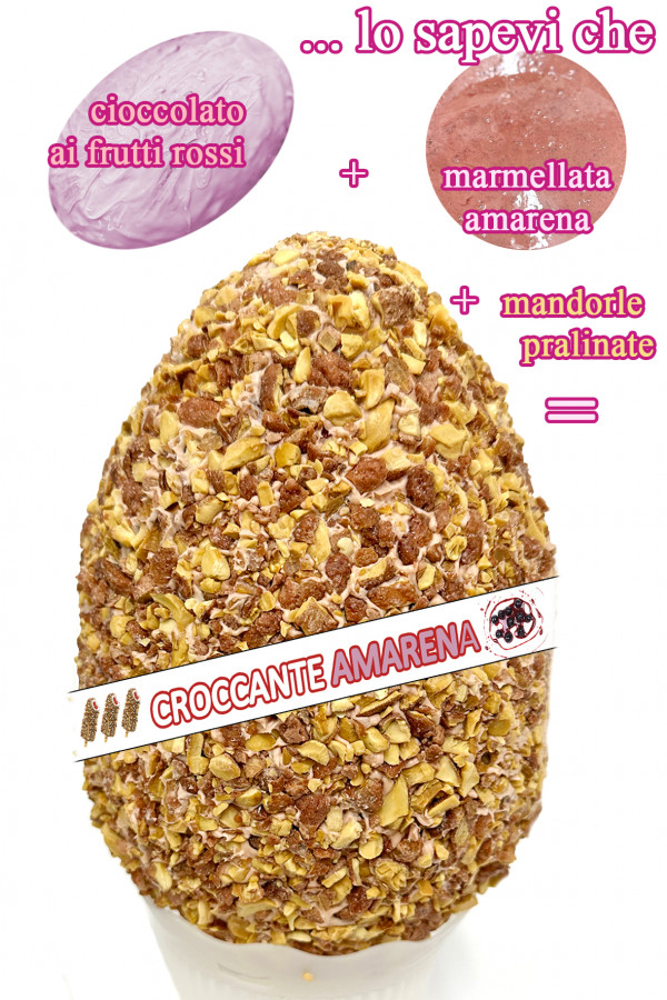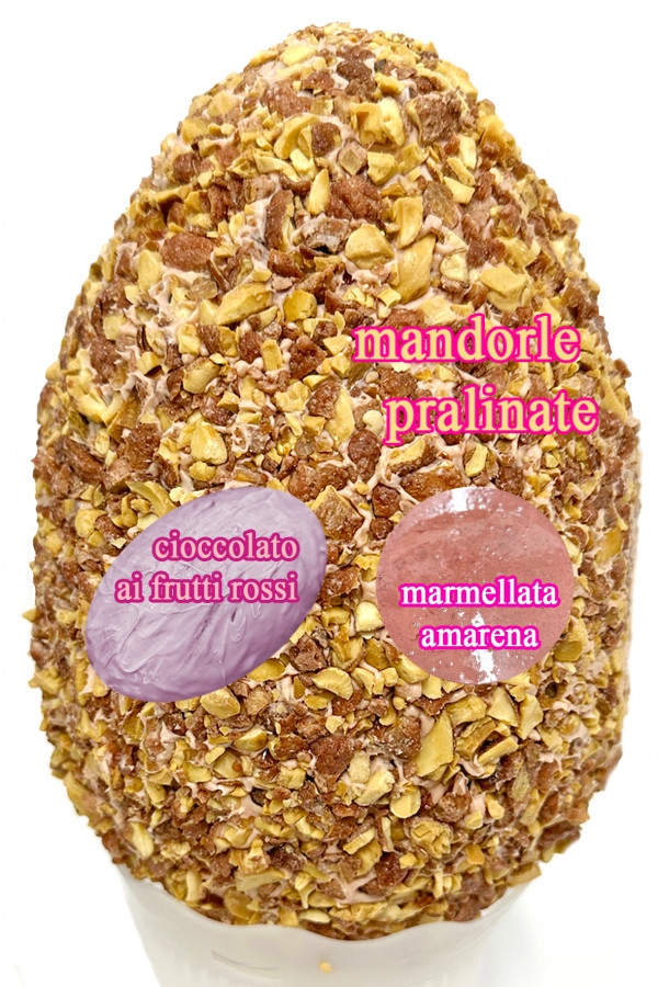 Ricetta: Base di cioccolato al latte ad alta percentuale di cacao (36% minimo), spalmabile ai frutti rossi, variegato alla marmellata di amarena homemade, ricoperta da croccanti mandorle pralinate.